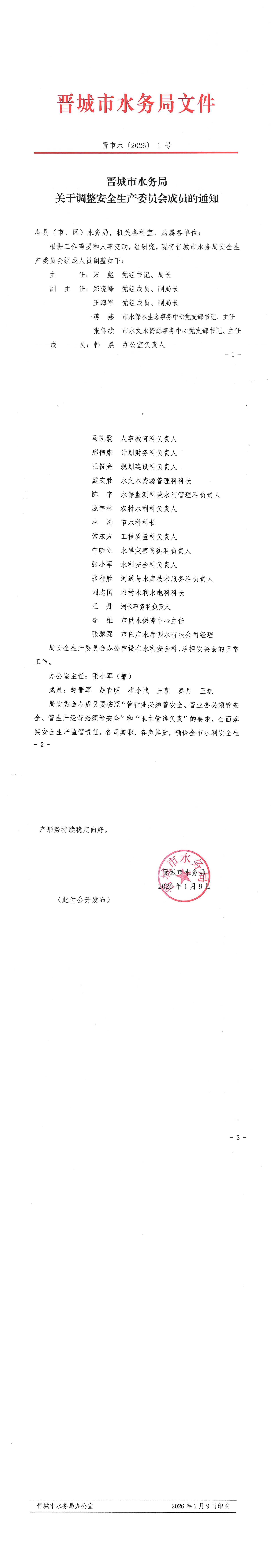 晋城市水务局调整安全生产委员会成员的通知